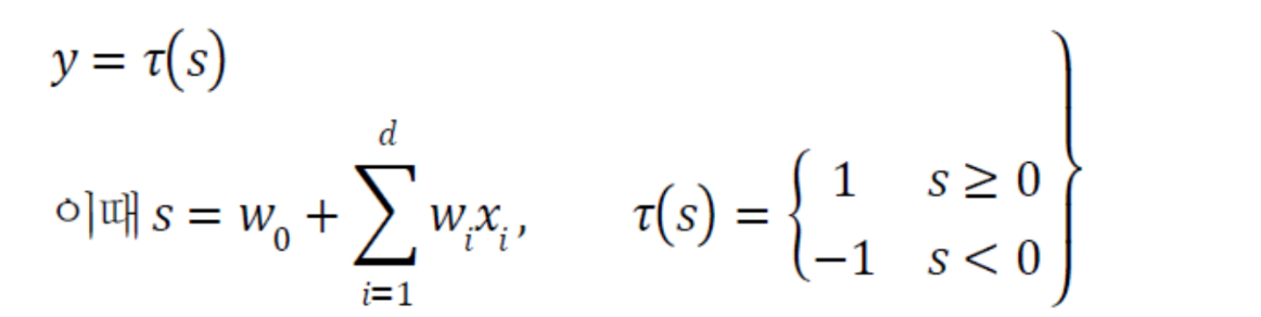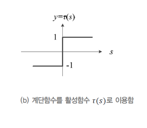 활성 함수 τ 로 계단 함수를 사용하므로 최종 출력 y는 +1 또는 -1 이 출력 값