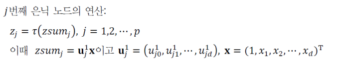 - 특징 값과 가중치를 곱한 결과를 모두 더하여서 s를 구하고 활성 함수 τ 를 적용한다.