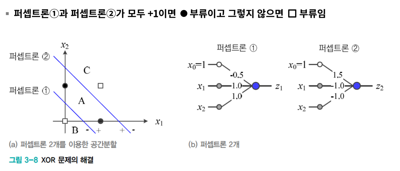 - 왼쪽 다층 퍼셉트론은 2층 퍼셉트론이다.