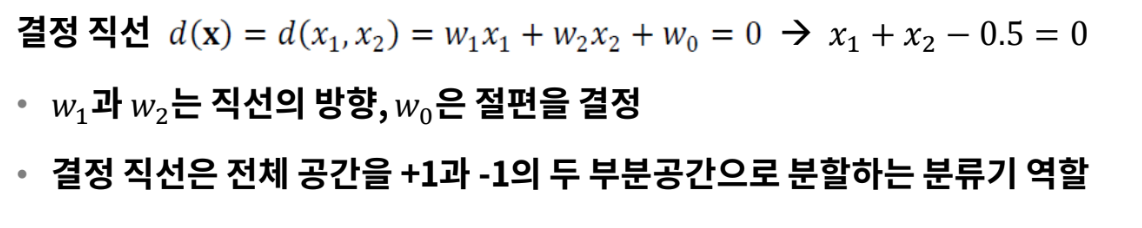 - 결정 직선은 특징 공간을 +1과 -1의 두 부분공간으로 이분할하는 분류기 역할이다.